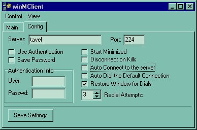 | Voilà la configuration de WinMClient quand on clique sur l'onglet Config, on doit indiquer le nom du serveur linux (ou son adresse IP) ainsi que le port, vous pouvez choisir l'authentification et éventuellement d'autres paramètres, la config peut être sauvegardée. | ![]() |