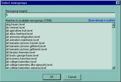 A ce moment là on se déconnecte, on retourne dans le menu d'hamster avec Online puis All servers (News+Mail) puis la liste de tous les newsgroups va s'afficher, avec la syntaxe pour chaque newsgroup, "nom-du-newsgroup,nom-du-serveur-de-news". Vous avez la possiblité de mettre un filtre pour l'affichage (dans l'exemple à droite fr. pour avoir les newsgroups français). Pour sélectionner les newsgroups, il faut cliquer sur le newsgroup désiré, pour en sélectionner plusieurs, maintenez la touche CTRL enfoncée, puis en final cliquez sur OK. |