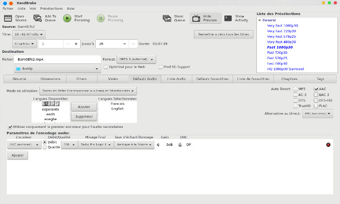 peut choisir les pistes audio et l'encodeur (par défaut AAC),