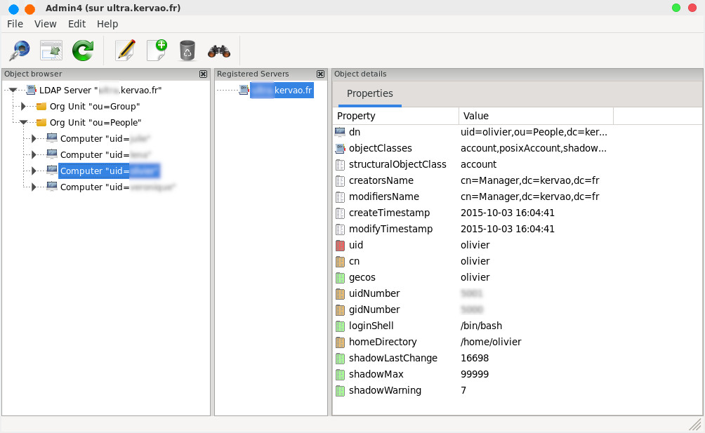 modifying entry "uid=olivier, ou=People, dc=kervao, dc=fr"
