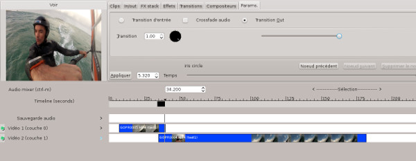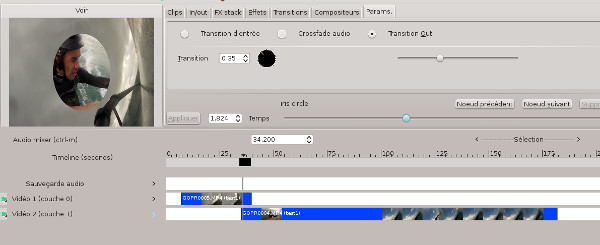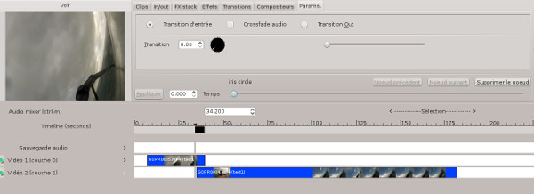 Effets->Apply effect to region... ->Transitions...->Transitions Audio/Vidéo...->iris circle Attention à bien vérifier qu'aucune transition n'ait été sélectionnée via le menu