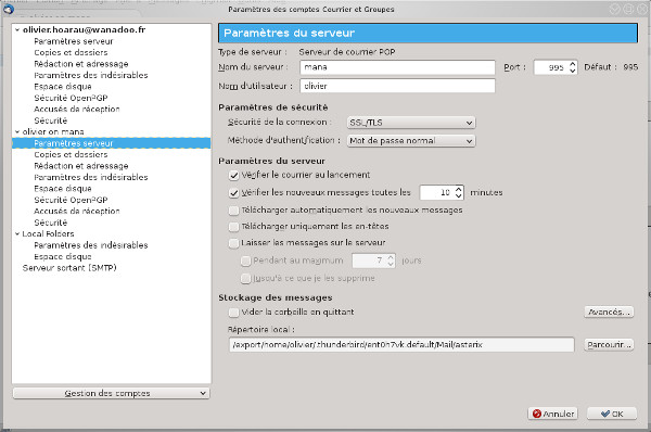 Le fichier fetchmail sous /var/log est le fichier de log, pop.fai.fr est le nom du serveur pop de votre provider. login-fai est le nom de votre login chez votre provider, password-fai est le mot de passe chez le provider, olivier est le login de l'utilisateur local correspondant. Vous rajoutez autant de ligne poll et user que vous avez de compte pop à droite et à gauche, vous noterez qu'on peut en profiter pour relever les emails d'autres utilisateurs de votre réseau (dans l'exemple utilisateur du réseau privé veronique).