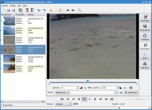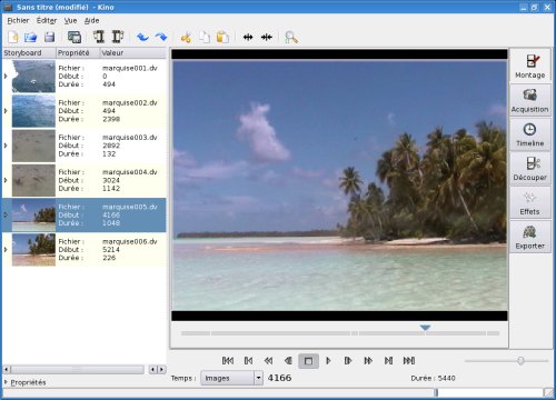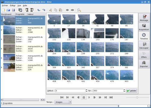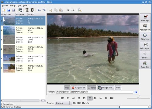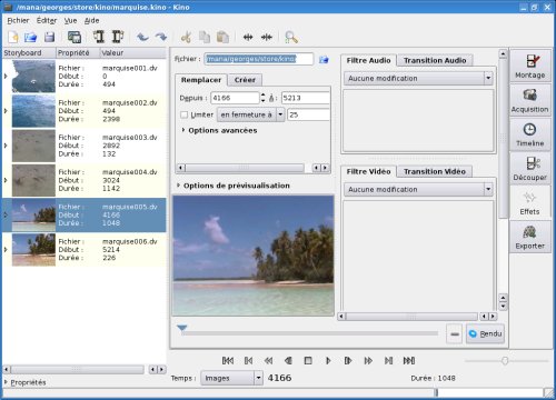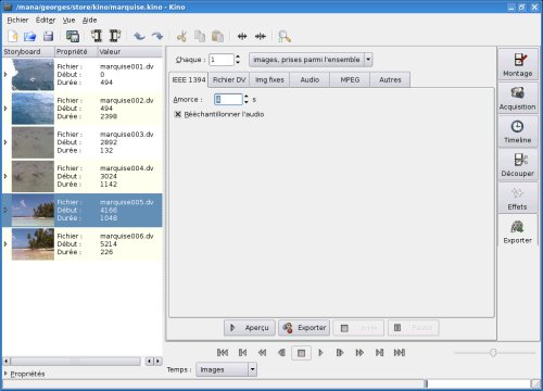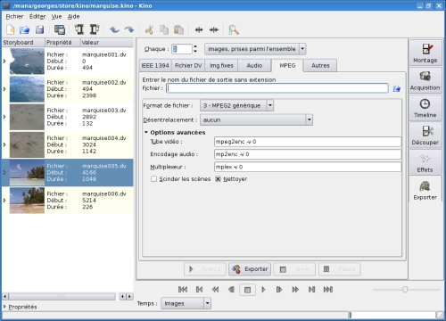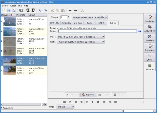 L'exportation au format divx marche enfin très bien il utilise pour cela ffmpeg (présenté dans ma page outils de base pour la vidéo). Cela dit vous ne pouvez pas saisir de paramètres de transcodage à ffmeg, ils sont figés, on peut modifier cela pour que ça corresponde à vos attentes.Editer le fichier kino-1.3.4/scripts/exports/ffmpeg_divx.sh vous trouverez les lignes