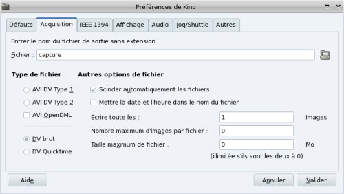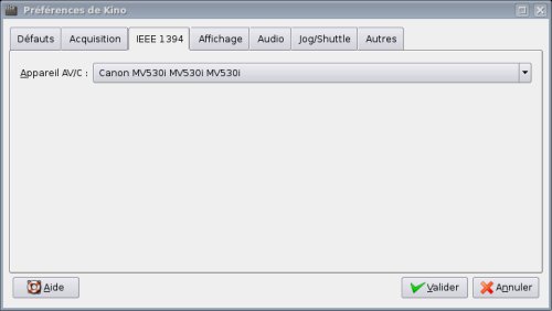 Voilà pour la configuration (Menu Editions->Préférences). Onglet IEEE 1394. Je me suis contenté de charger le module raw1394 par défaut kino utilise maintenant libiec61883 au lieu de dv1394, si vous avez néanmoins des soucis d'export vers le caméscope, vous pouvez toujours compiler kino avec l'option --with-dv1394