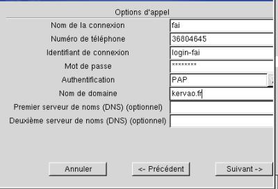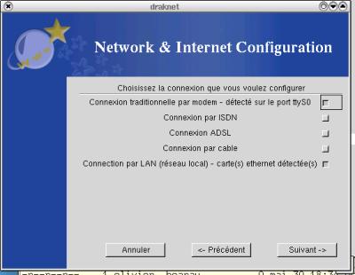 - identifiant de la connexion (mettez ce que vous voulez) - numéro de téléphone - votre login - votre mot de passe - type d'authentification (CHAP pour free par exemple) - nom de domaine, vous n'êtes pas obligé de mettre celui du FAI - éventuellement les adresses DNS du FAI Puis Suivant pour terminer la configuration. Drakconf passe ensuite à la configuration des autres connexions détectées, pour ma part cela concerne uniquement la connexion réseau, je clique sur Annuler si je ne veux pas aller plus loin. |