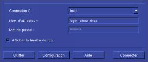 Le nom de l'utilisateur et le mot de passe vous ont été attribués par le FAI. Pour configurer la connexion, il suffit d'appuyer sur la bouton Configuration. A noter qu'en cochant Afficher la fenêtre de log, vous aurez des info sur le déroulement de la connexion, ce qui peut être intéressant pour débuguer. |