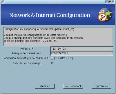 Saisissez l'adresse IP de votre machine et le netmask, sachant que pour un réseau non connecté directement à Internet et donc non officiel, il existe une plage réservée qui va de 192.168.1.X à 192.168.255.X avec X de 1 à 255, avec un netmask (masque de sous réseau) de 255.255.255.0 car ce sont des adresses de classe C (cf. cours réseau).