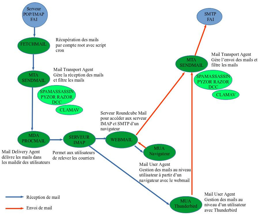 Pour la réception des mails et l'installation des serveurs POP, IMAP et du webmail on consultera cette page, pour la lutte antispam et antivirus c'est par ici.