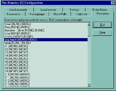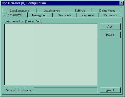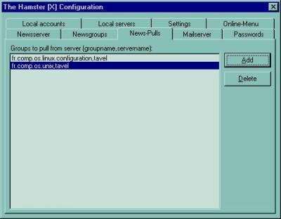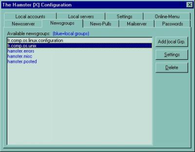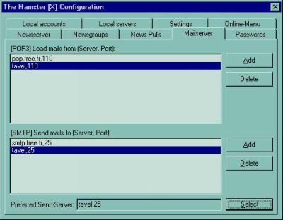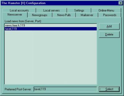 Vous pouvez sélectionner un serveur de news par défaut, pour cela sélectionnez celui qui vous intéresse puis cliquez sur le bouton Select. Cela peut servir quand on va choisir un même newsgroup se trouvant sur deux serveurs de news, hamster va choisir le newsgroup du serveur préféré. Dans le screenshot à droite, tavel est mon serveur de news tournant sous linux (leafnode). NOTE: 119 est le port traditionnel du serveur NNTP |