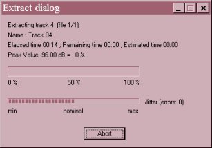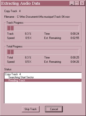 Vous pouvez choisir de n'extraire les tracks et en faire des WAV et utiliser ensuite un autre logiciel. Pour cela sélectionner les tracks désirés puis avec la touche droite de la souris, sélectionnez Copy Selected Tracks (ou touche F5), vous devez ensuite choisir le répertoire de destination des fichiers obtenus. La fenêtre d'avancement de l'extraction s'affiche alors :