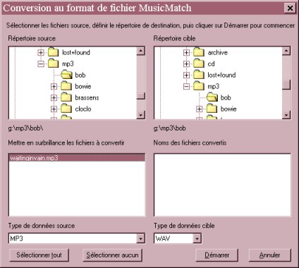 Les formats source sont MP3,WAV,WMA, les formats destination sont MP3 CBR, MP3 VBR, WMA (on a le choix du taux de compression possible). Une fois les fichiers choisis on clique sur Démarrer pour commencer la conversion.
