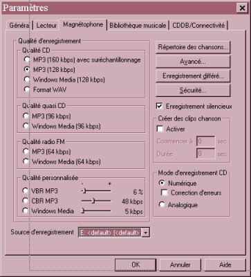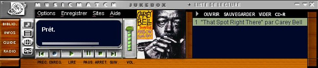 Au niveau de la barre de menu, Options permet de configurer le logiciel, Enregistrer pour s'enregistrer, Sites pour avoir accès à un certain nombre de sites musicaux, dont des bases de données CDDB.