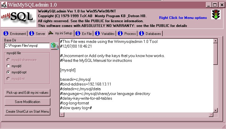 En fait l'onglet par défaut à l'apparition de la fenêtre est Environment qui détaille votre environnement (nom de la machine, adresse IP, utilisateur, version logicielle, ...). L'onglet my.ini Setup permet de modifier son fichier my.ini, on pourra ainsi modifier le répertoire de base de MySQL dans le champ Base dir et au niveau de la variable basedir et éventuellement changer la langue par défaut en remplaçant: