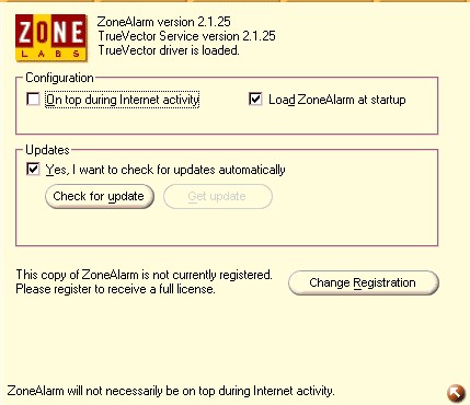Dans cette page vous pouvez définir si les fenêtres ZoneAlarm doivent être devant toutes les autres ou pas, c'est à dire que dès que vous êtes connecté à internet la fenêtre principale de ZoneAlarm masquera en permanence vos autres pages, c'est très génant je vous conseille donc de décocher prestement cette case. Vous pouvez définir que ZoneAlarm soit lancé au démarrage (startup) de windows. Les autres champs correspondent à l'update de ZoneAlarm et à l'enregistrement de la licence.