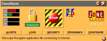 On peut voir le trafic entrant et sortant de/vers internet (rouge montant, vert descendant), et les programmes accèdant à internet sont à droite du bouton Stop, ici on n'a que Netscape.
